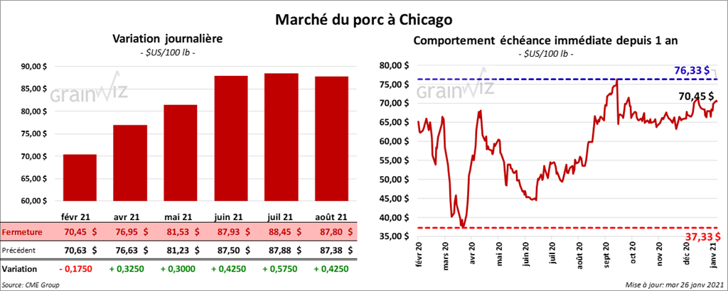 Les contrats de porc US aux échéances les plus rapprochées ont fini la journée en hausse entre 30 et 57 cents. Celui février 21 a fait l’inverse en terminant en baisse de 17 cents.