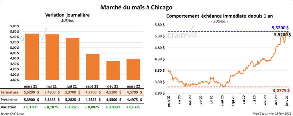 Les contrats de maïs US aux échéances les plus rapprochées ont terminé la séance en hausse entre 8 ¼ et 13 cents.