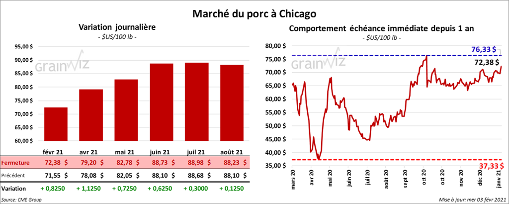 - Le 1er février dernier, le CME Lean Hog Index était en hausse de 60 cents à 68,87 $.