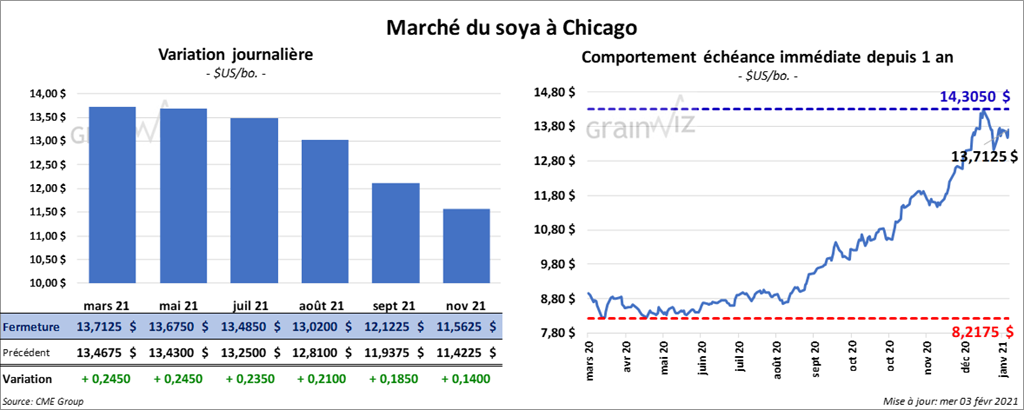 Les contrats de soya US aux échéances les plus rapprochées ont terminé la journée avec des gains entre 21 et 24 ½ cents. Ceux de tourteau de soya US aux échéances les plus rapprochées ont également clôturé dans le vert entre 6,10 et 7,50 $/tonne. Les contrats d’huile de soya US aux échéances les plus rapprochées ont fermé en hausse entre 9 et 16 points.