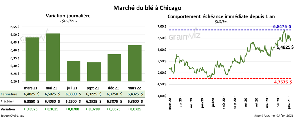 À Chicago, les contrats de blé aux échéances les plus rapprochées ont fini la journée en hausse entre 7 et 10 ¼ cents. À Kansas, les contrats de blé dur rouge aux échéances les plus rapprochées ont aussi terminé la session avec des gains entre 6 ½ et 7 ¼ cents. À Minneapolis, ceux de blé de printemps aux échéances les plus rapprochées ont fermé dans le vert entre 4 et 4 ¾ cents.