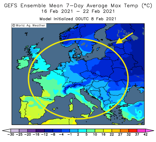 - En Europe, le blé d’hiver a démontré une résistance au froid au cours du mois de décembre dernier, mais les conditions chaudes observées le mois suivant font penser qu’un simple épisode de gel durant les prochains jours pourrait occasionner des dommages au blé d’hiver.