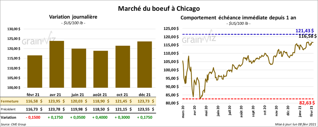 À l’exception du contrat février 21, qui a terminé en baisse de 15 cents, les contrats de bœuf US aux échéances les plus rapprochées ont fini la session en hausse entre 5 et 40 cents. Les contrats de veau US aux échéances les plus rapprochées ont clôturé avec des pertes entre 72 cents et 1,20 $.