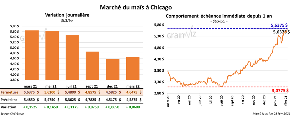 Les contrats de maïs US aux échéances les plus rapprochées ont terminé la session en hausse entre 7 ½ et 15 ¼ cents.
