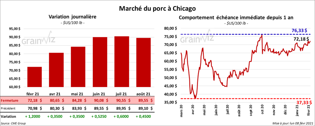 - Le 4 février dernier, le CME Lean Hog Index était en hausse de 18 cents à 69,27 $.