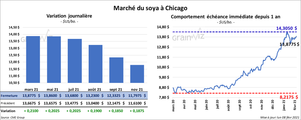 Les contrats de soya US aux échéances les plus rapprochées ont fini la session en hausse entre 19 et 21 cents. Ceux de tourteau de soya US aux échéances les plus rapprochées ont également clôturé avec des gains entre 6,00 et 6,60 $/tonne. Les contrats d’huile de soya US aux échéances les plus rapprochées ont fermé dans le vert entre 77 et 97 points.