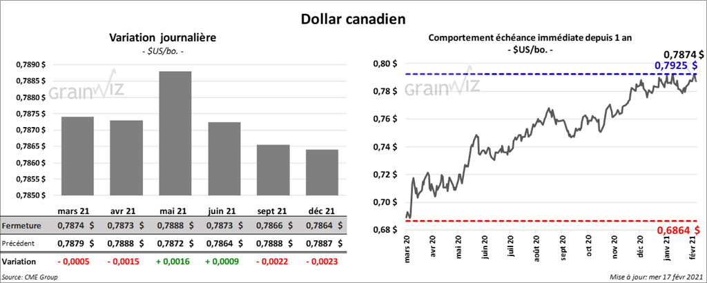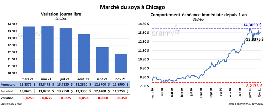 Les contrats de soya US aux échéances les plus rapprochées ont fini la journée en baisse entre 2 ¼ et 5 cents. Ceux de tourteau de soya US aux échéances les plus rapprochées ont fait l’inverse en clôturant avec des gains entre 2,30 et 3,30 $/tonne. Les contrats d’huile de soya US aux échéances les plus rapprochées ont terminé dans le rouge entre 44 et 50 points.