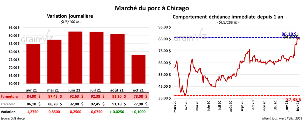 - Le 12 février dernier, le CME Lean Hog Index était en hausse de 1,39 $ à 74,54 $.