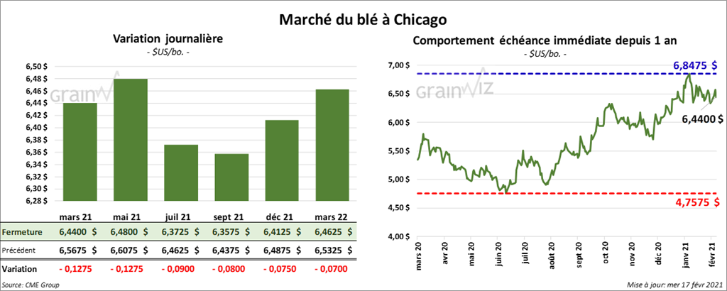 Les contrats de blé US aux échéances les plus rapprochées ont terminé la journée en baisse entre 8 et 12 ¾ cents. À Kansas, les contrats de blé dur rouge aux échéances les plus rapprochées ont aussi fermé avec des pertes entre 11 et 13 cents. À Minneapolis, ceux de blé de printemps aux échéances les plus rapprochées ont clôturé dans le rouge entre 6 ¼ et 8 ¼ cents.