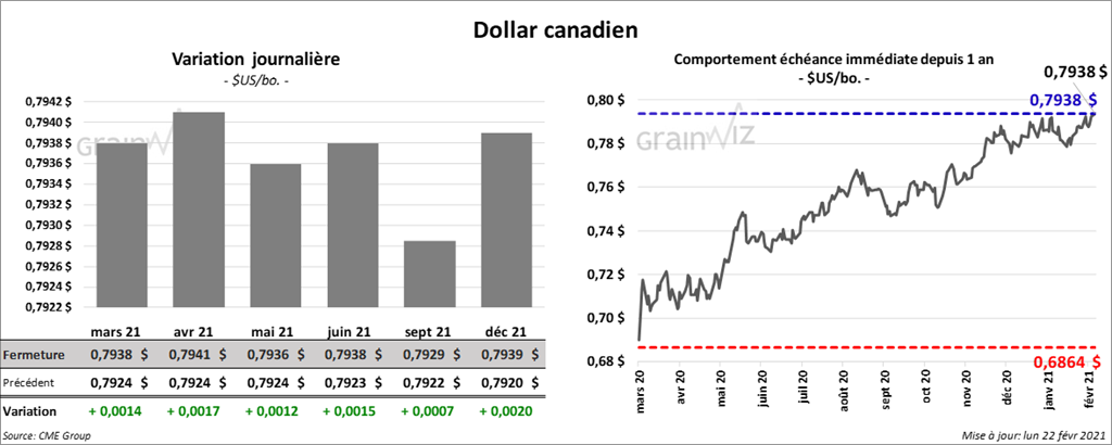 - Au cours de la semaine du 18 février dernier, les inspections à l’exportation de soya US ont baissé de 21,7 % comparativement à la semaine précédente à 721,845 tonnes. Par contre, c’était également une augmentation de 25,9 % par rapport à l’an dernier. Le cumulatif annuel des inspections à l’exportation de soya US était en hausse de 76,6 % comparativement à celui de l’an passé à 50,916,438 tonnes. Les prévisions des analystes ont été entre 300,000 et 950,000 tonnes. Les Pays-Bas ont été la principale destination.