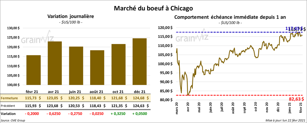 - Le 19 février dernier, le CME Feeder Cattle Index était en hausse de 3,01 $ à 141,12 $.