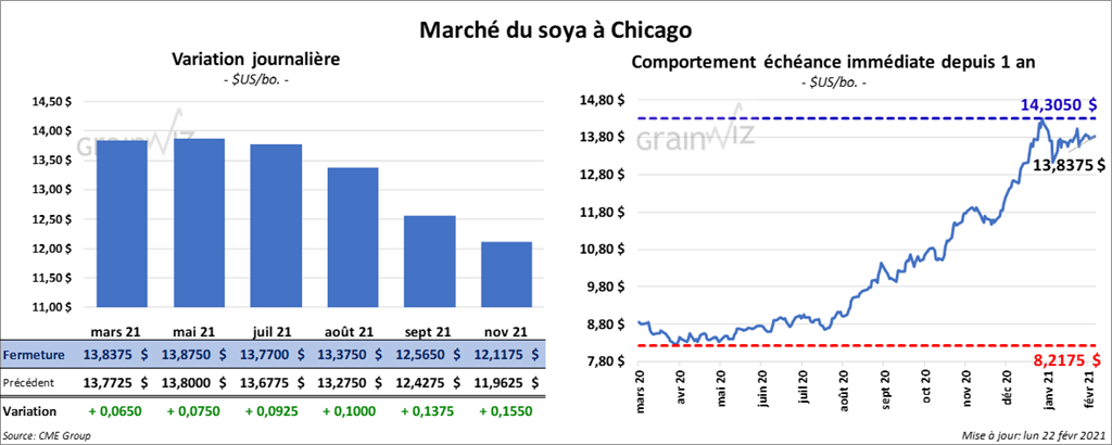 Les contrats de soya US aux échéances les plus rapprochées ont terminé la session en hausse entre 6 ½ et 13 ¾ cents. Ceux de tourteau de soya US aux échéances les plus rapprochées ont fini quelque part entre une baisse de 70 cents et une hausse de 3,90 $/tonne. Les contrats d’huile de soya US aux échéances les plus rapprochées ont clôturé avec des gains entre 33 et 35 points.
