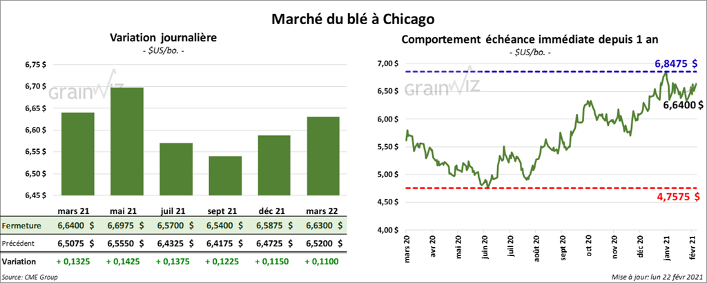 À Chicago, les contrats de blé aux échéances les plus rapprochées ont terminé la journée en hausse entre 12 ¼ et 14 ¼ cents. À Kansas, ceux de blé dur rouge aux échéances les plus rapprochées ont fini avec des gains entre 12 et 12 ¾ cents. À Minneapolis, les contrats de blé de printemps aux échéances les plus rapprochées ont clôturé dans le vert entre 9 et 9 ¾ cents.