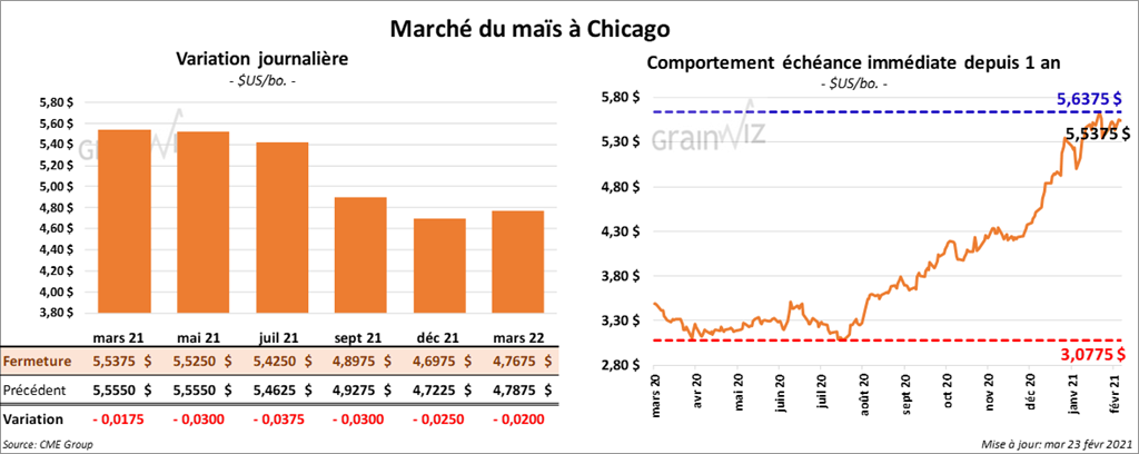 Les contrats de maïs US aux échéances les plus rapprochées ont terminé la journée en baisse entre 1 ¾ et 3 ¾ cents.