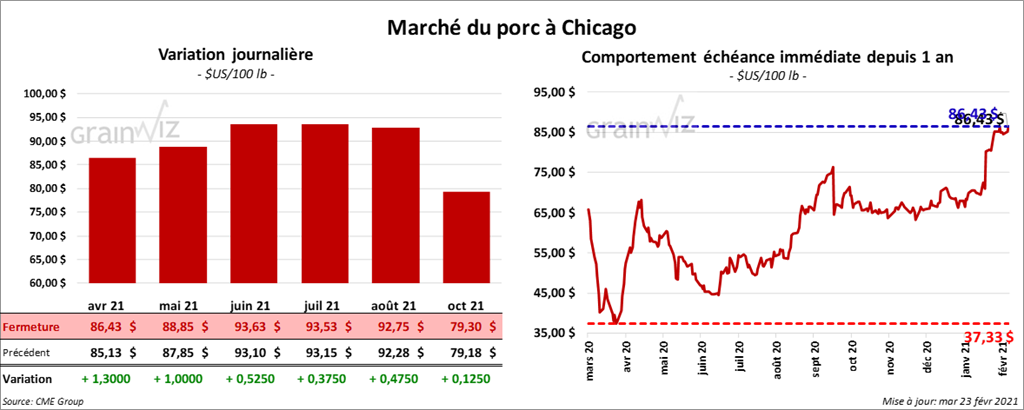 - Le 18 février dernier, le CME Lean Hog Index était en hausse de 23 cents à 77,43 $.