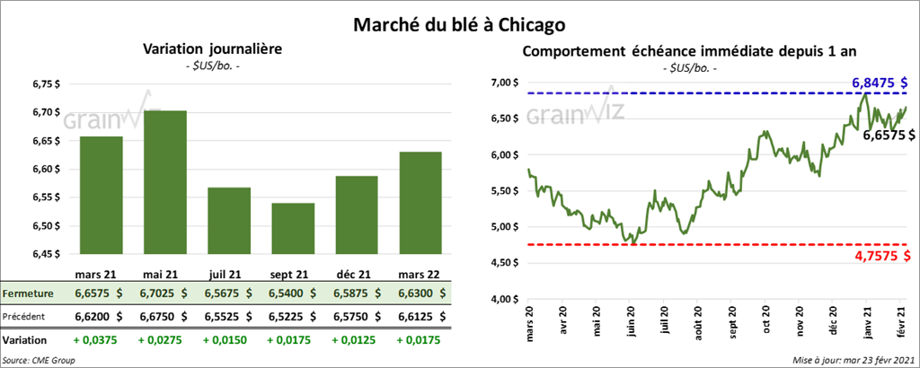 À Chicago, les contrats de blé aux échéances les plus rapprochées ont terminé la session en hausse entre 1 ½ et 3 ¾ cents. À Kansas, les contrats de blé dur rouge aux échéances les plus rapprochées ont clôturé avec des pertes entre 3 ½ et 4 cents. À Minneapolis, ceux de blé de printemps ont fermé en baisse entre ¾ et 1 ¾ cent.