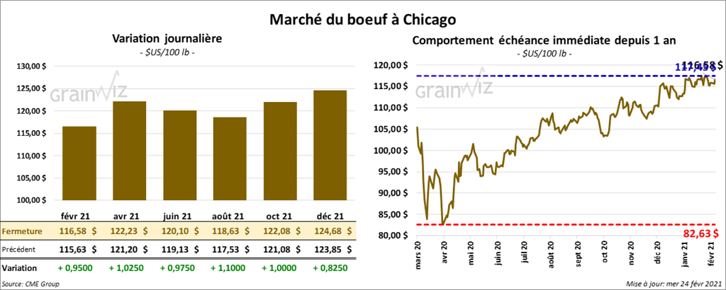 - Le 22 février dernier, le CME Feeder Cattle Index était en baisse de 73 cents à 140,39 $.