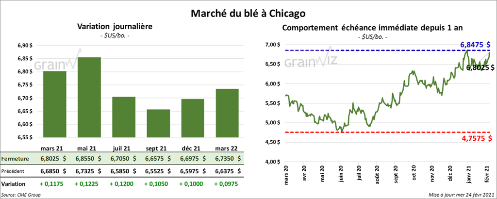 À Chicago, les contrats de blé aux échéances les plus rapprochées ont terminé la séance en progression entre 10 ½ et 12 ¼ cents. À Kansas, ceux de blé dur rouge aux échéances les plus rapprochées ont clôturé dans le vert entre 15 et 15 ¾ cents. À Minneapolis, les contrats de blé de printemps aux échéances les plus rapprochées ont aussi fini la journée en hausse entre 8 ¼ et 10 ½ cents.