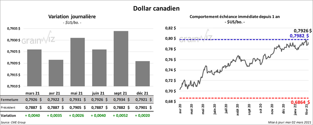 - Le rapport Fats & Oils du mois de mars a été présenté hier par l’USDA. Il indique que 197 millions de boisseaux de soya US ont été triturés au cours du mois de janvier dernier, ce qui correspondait à une augmentation de 1,7 % par rapport à décembre 2020 et à une hausse de 4,1 % comparativement à janvier 2020. Les analystes s’attendaient à une moyenne de 195,6 millions de boisseaux. Les stocks d’huile de soya US pour le mois de janvier 21 ont été estimés à 1,882 milliard de lb, soit en hausse de 9,6 % par rapport à décembre dernier, mais aussi en baisse de 5,4 % par rapport à janvier 20. Le marché s’attendait à une moyenne de 2,315 milliards de lb.