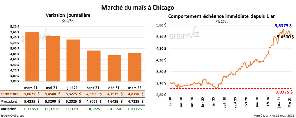 - Hier, le rapport du mois de mars sur la transformation et sous-produits des grains (USDA) avait été présenté. Il montre qu’en janvier dernier, 415,804 millions de boisseaux de maïs avaient été utilisés dans la fabrication de l’éthanol US, ce qui était une baisse de 3,7 % par rapport à décembre 2020 et une réduction de 11,4 % comparativement à janvier 2020. Quant à la drêche, l’USDA mentionne qu’en janvier dernier, 1,753,401 tonnes avaient été produites, soit une baisse de 1,9 % par rapport à décembre 2020 et une réduction de 10 % comparativement à janvier 2020.