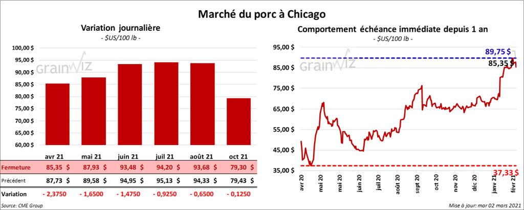 - Le 25 février dernier, le CME Lean Hog Index était en hausse de 75 cents à 80,70 $.