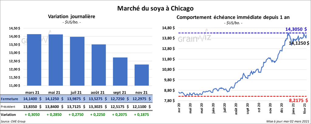 Les contrats de soya US aux échéances les plus rapprochées ont fini la journée en hausse entre 20 ¾ et 28 ½ cents. Ceux de tourteau de soya US aux échéances les plus rapprochées ont fermé avec des gains entre 3,50 et 3,90 $/tonne. Les contrats d’huile de soya US aux échéances les plus rapprochées ont terminé la séance entre 40 et 45 points.