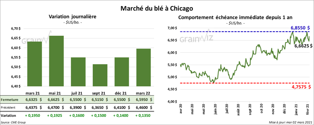 À Chicago, les contrats de blé aux échéances les plus rapprochées ont terminé la session en hausse entre 14 et 19 ¼ cents. À Kansas, les contrats de blé dur rouge aux échéances les plus rapprochées ont clôturé avec des gains entre 11 ¾ et 12 cents. À Minneapolis, ceux de blé de printemps aux échéances les plus rapprochées ont fini en progression entre 9 ¾ et 11 ¾ cents.