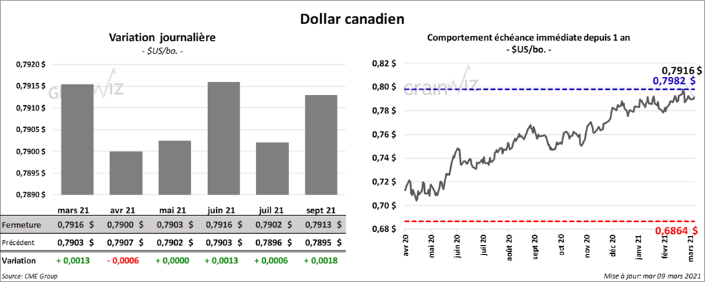 - Mondialement, l’USDA estime que les stocks de fin d’année de maïs sont en hausse de 0,4 % par rapport à février dernier à 287,67 millions de tonnes. Il s’agit aussi d’une réduction de 5 % comparativement à 2019/20. Les anticipations des analystes étaient en moyenne à 284,23 millions de tonnes. Pour l’Argentine, l’USDA ne voit pas de changement de production par rapport à février dernier. Par conséquent, le résultat demeure à 47,5 millions de tonnes. L’an passé, à la même période, la récolte de maïs argentin avait été évaluée à 51,0 millions de tonnes. Du côté du Brésil, il n’y a pas non plus de changement par rapport à février dernier puisque la récolte est toujours estimée à 109 millions de tonnes. L’an passé, à la même période, c’était 102,0 millions de tonnes.