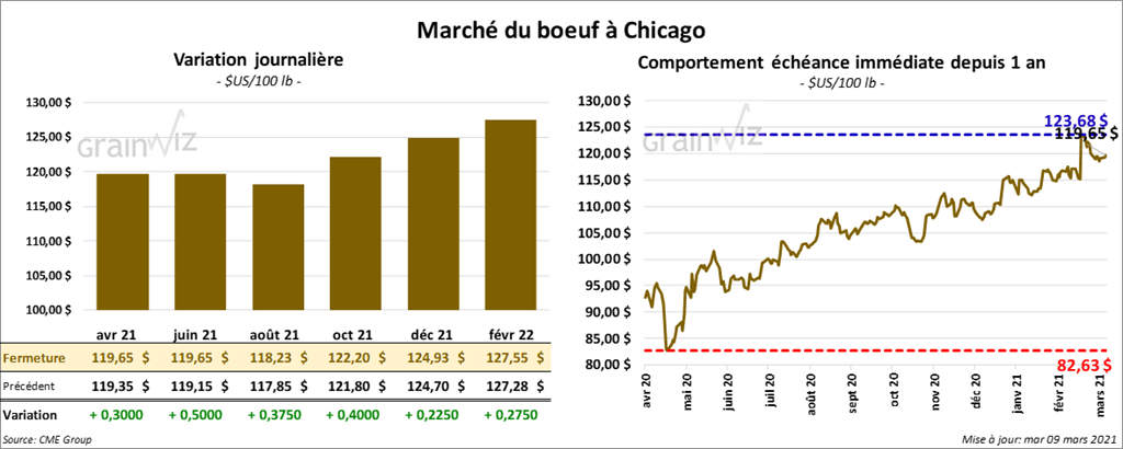 - Le 8 mars dernier, le CME Feeder Cattlle Index était en hausse de 10 cents à 134,02 $.