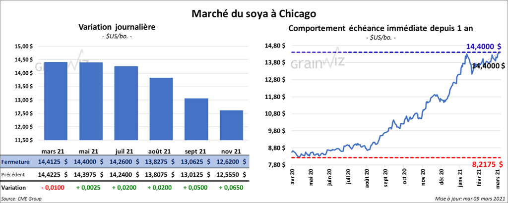 Les contrats de soya US aux échéances les plus rapprochées ont clôturé avec des gains entre ¼ et 5 cents. Ceux de tourteau de soya US aux échéances les plus rapprochées ont terminé quelque part entre une hausse de 30 cents et une baisse de 1,10 $/tonne. Les contrats d’huile de soya US aux échéances les plus rapprochées ont fermé avec des gains entre 1,87 % et 2,08 %.