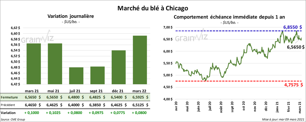 À Chicago, les contrats de blé aux échéances les plus rapprochées ont fini la journée en hausse entre 7 ¾ et 10 ¼ cents. À Kansas, ceux de blé dur rouge aux échéances les plus rapprochées ont également clôturé dans le vert entre 4 ½ et 4 ¾ cents. À Minneapolis, les contrats de blé de printemps ont terminé la session avec des gains entre 5 ¾ et 7 ¼ cents.