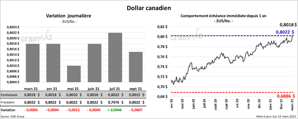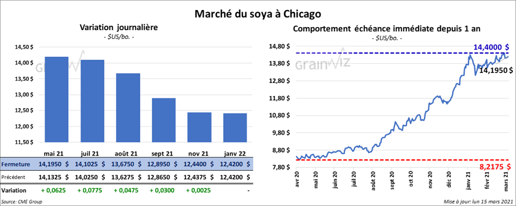 Les contrats de soya US aux échéances les plus rapprochées ont terminé la journée en progression entre ¼ et 7 ¾ cents. Ceux de tourteau de soya US aux échéances les plus rapprochées ont également clôturé avec des gains entre 1,60 et 6,70 $/tonne. Les contrats d’huile de soya US ont fermé dans le rouge entre 27 et 35 points.