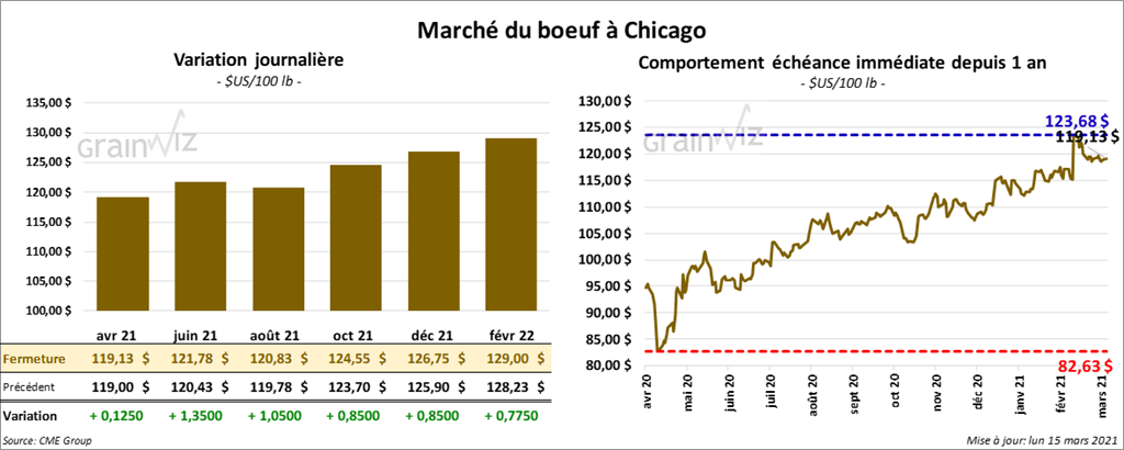 - Le 11 mars dernier, le CME Feeder Cattle Index était en hausse de 28 cents à 134,13 $.
