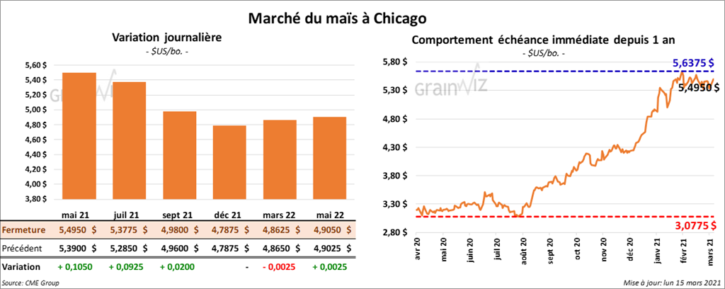 Les contrats de maïs US aux échéances les plus rapprochées ont fini la journée en hausse entre 2 et 10 ½ cents. Le contrat décembre 21 a fait exception en clôturant au neutre.