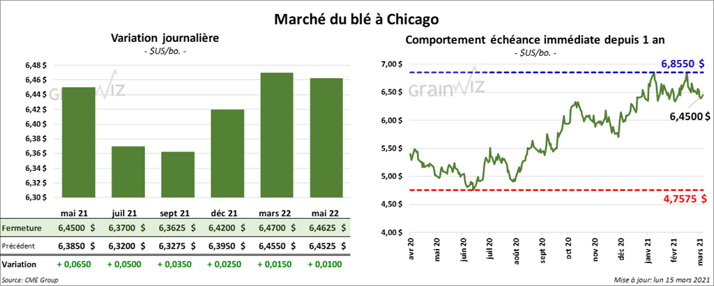 À Chicago, les contrats de blé aux échéances les plus rapprochées ont clôturé avec des gains entre 2 ½ et 6 ½ cents. À Kansas, ceux de blé dur rouge aux échéances les plus rapprochées ont terminé en hausse entre 2 et 3 ¼ cents. À Minneapolis, les contrats de blé de printemps aux échéances les plus rapprochées ont également fermé dans le vert entre 4 ½ et 5 ¼ cents.