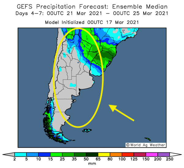 Cette carte montre les précipitations prévues dans les 4 à 7 prochains jours pour l'Argentine