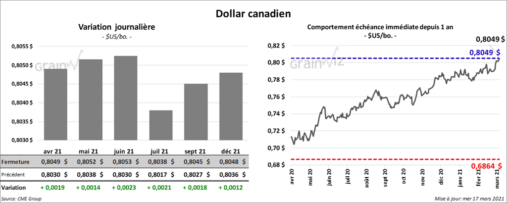 - Pour le rapport sur les ventes à l’exportation qui sera présenté demain, les analystes prévoient que celles de blé US 2020/21 seront entre 150,000 et 500,000 tonnes. Celles de 2021/22 sont projetées entre 0 et 100,000 tonnes.