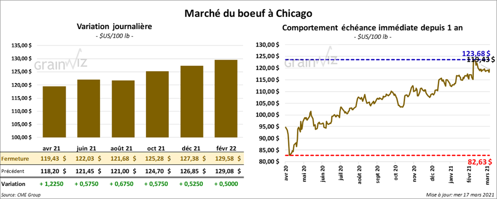 - Le 16 mars dernier, le CME Feeder Cattle Index était en hausse de 6 cents à 133,95 $.