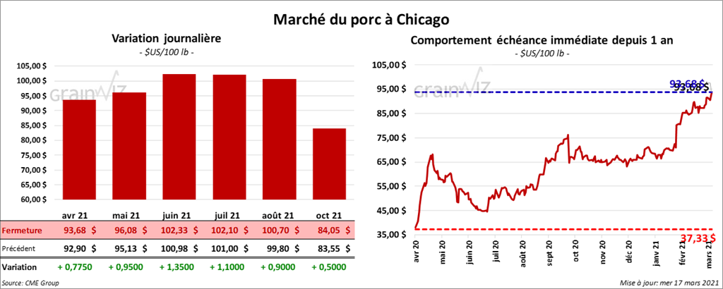 - Le 15 mars dernier, le CME Lean Hog index était en hausse de 56 cents à 89,56 $.