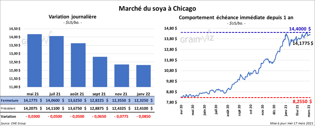 Les contrats de soya US aux échéances les plus rapprochées ont terminé la journée en baisse entre 3 et 6 ½ cents. Ceux de tourteau de soya US aux échéances les plus rapprochées ont fermé entre le neutre et des baisses allant de 1 $ à 1,50 $/tonne. Les contrats d’huile de soya US aux échéances les plus rapprochées ont également clôturé avec des pertes entre 49 et 67 points.