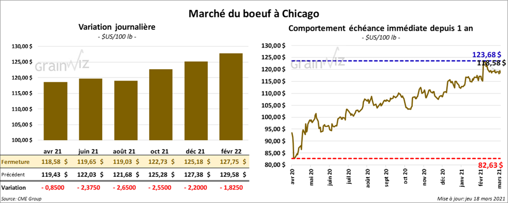 Les contrats de bœuf US aux échéances les plus rapprochées ont terminé la session en baisse entre 85 cents et 2,65 $. Ceux de veau US aux échéances les plus rapprochées ont aussi fini dans le rouge entre 1,75 et 3,55 $.