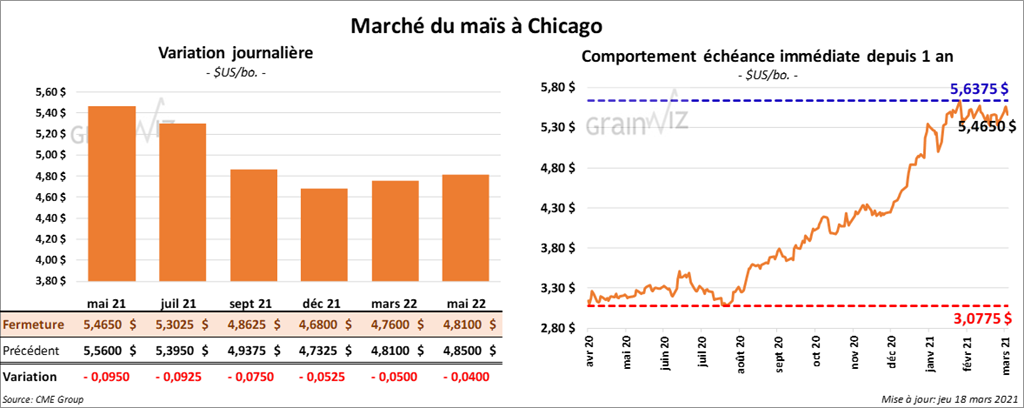 Les contrats de maïs US aux échéances les plus rapprochées ont terminé la séance en baisse entre 5 ¼ et 9 ½ cents.