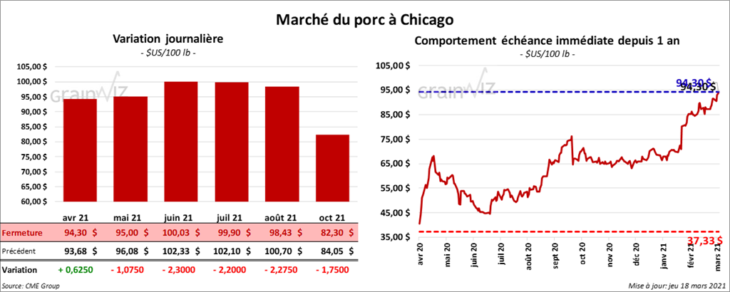 - Le 16 mars dernier, le CME Lean Hog Index était en hausse de 65 cents à 90,56 $.