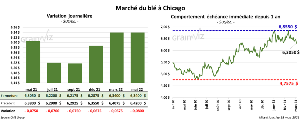 À Chicago, les contrats de blé aux échéances les plus rapprochées ont fini la journée en baisse entre 6 ¾ et 7 ½ cents. À Kansas, ceux de blé dur rouge aux échéances les plus rapprochées ont terminé la session avec des pertes entre 12 ¾ et 14 cents. À Minneapolis, les contrats de blé de printemps aux échéances les plus rapprochées ont clôturé en recul entre 5 ¾ et 7 ¾ cents.