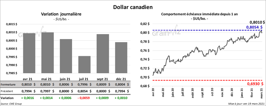 - Un correspondant de l’USDA au Canada a abaissé son estimation des inventaires de canola canadien à seulement 700,000 tonnes pour 2020/21. Dans son rapport du WASDE de mars, l’USDA estimait les stocks de canola canadien à 1,2 million de tonnes, soit à une baisse de 61,3 % par rapport à l’an passé.