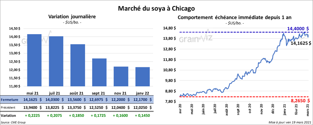 Les contrats de soya US aux échéances les plus rapprochées ont fini la journée en hausse entre 16 et 22 ¼ cents. Ceux de tourteau de soya US aux échéances les plus rapprochées ont aussi clôturé avec des gains entre 5,60 et 9,70 $/tonne. Les contrats d’huile de soya US aux échéances les plus rapprochées ont par contre terminé quelque part entre une hausse de 35 points et une baisse de 4 points.