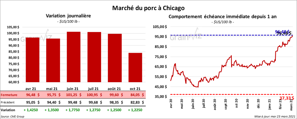 - Le 19 mars dernier, le CME Lean Hog Index était en hausse de 1,20 $ à 91,47 $.