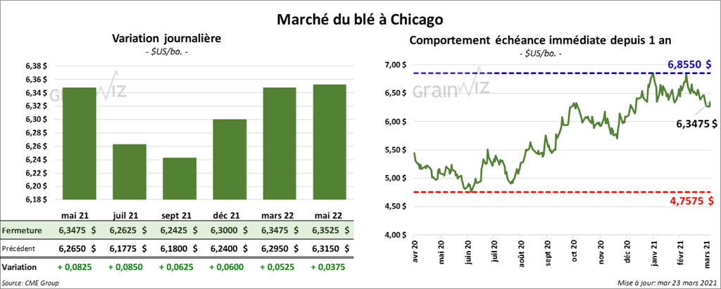 À Chicago, les contrats de blé aux échéances les plus rapprochées ont terminé la journée en hausse entre 6 et 8 ½ cents. À Kansas, ceux de blé de printemps aux échéances les plus rapprochées ont fini la session avec des gains entre 3 ¾ et 4 ½ cents. À Minneapolis, les contrats de blé de printemps aux échéances les plus rapprochées ont clôturé en progression entre 3 ½ et 4 ½ cents.