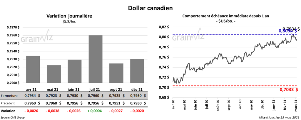 - En Argentine, le ministère de l’Agriculture estime qu’au 17 mars dernier, les producteurs argentins avaient vendu leur soya à un total de 28 %. De son côté, le Buenos Aires Grains Exchange anticipe la récolte de soya argentin 2020/21 à 44 millions de tonnes. L’USDA la prévoit à 47,5 millions de tonnes.