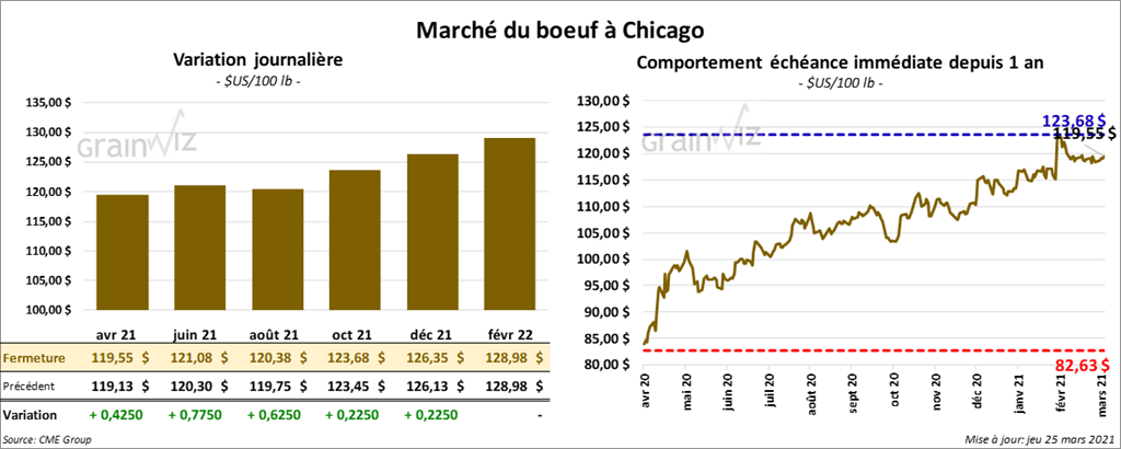 - Le 24 mars dernier, le CME Feeder Cattle Index était en hausse de 58 cents à 135,62 $.